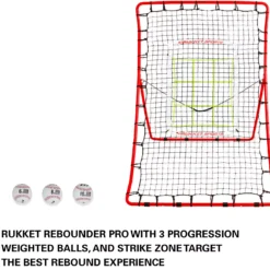 The Rukket Baseball/Softball Rebounder Pro with 3 progression weighted balls is the perfect tool to improve your pitching, fielding, and throwing. Folds flat for easy transport and storage. Curved design allows you to practice pop-ups, line drives, and grounders without having to adjust the net. Progression weighted pitching baseballs will challenge you to throw with more strength, accuracy, and focus.